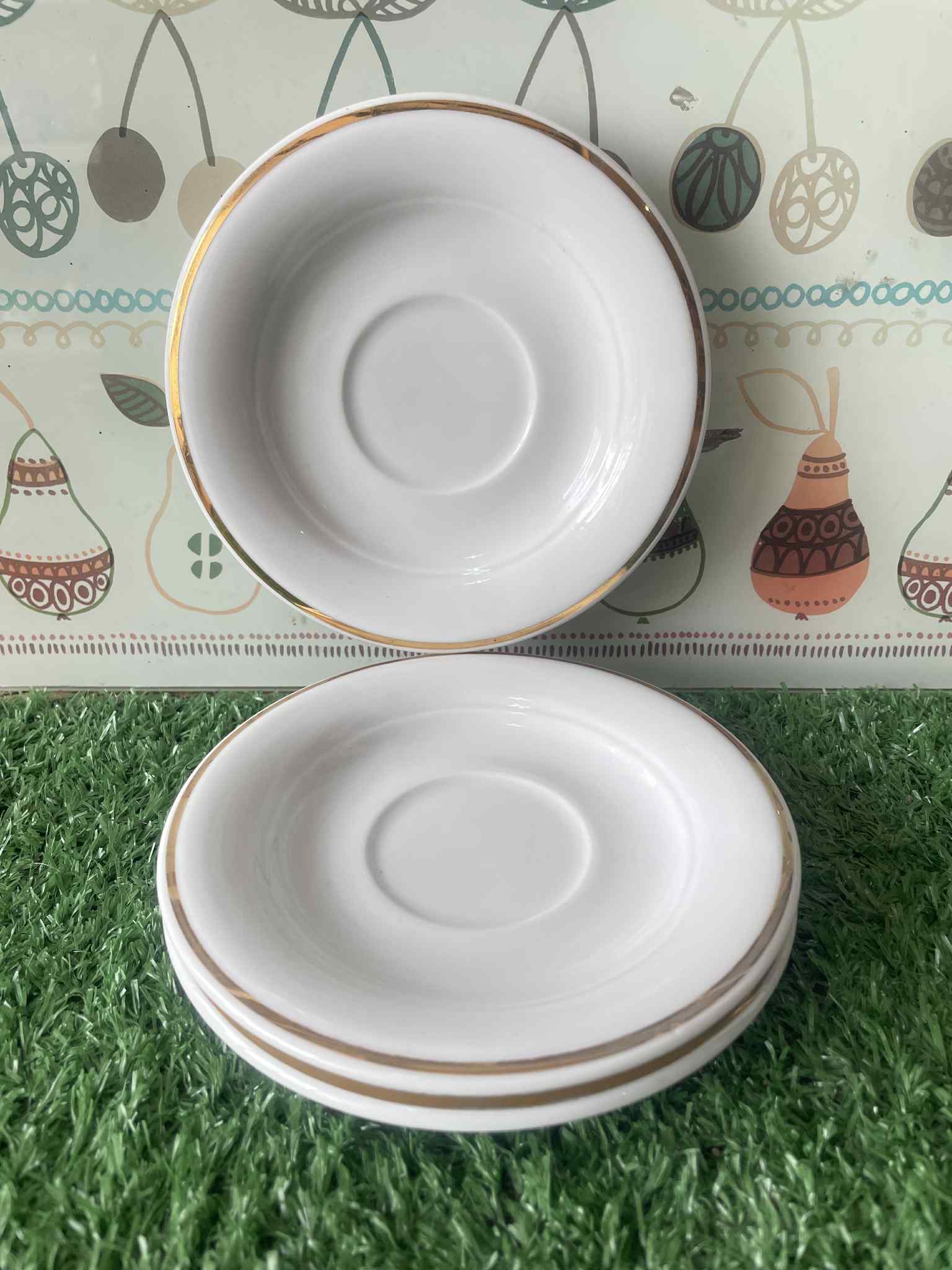 จานรองถ้วยพอร์ซเลนสีขาวขอบทอง