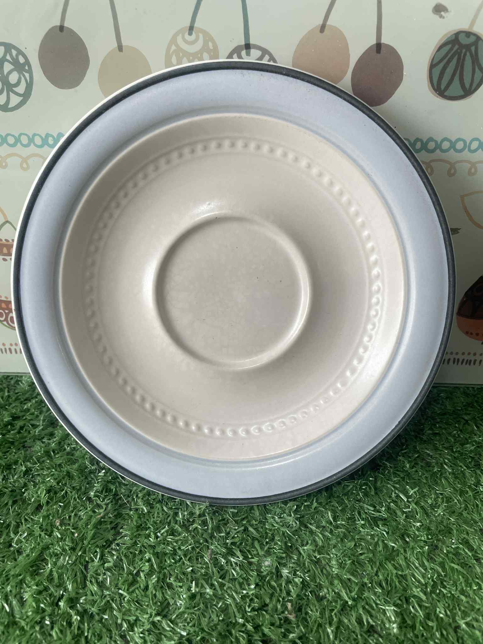 จานรองถ้วยเซรามิกสีขาวขอบสีฟ้าอ่อนและสีเทาเข้ม
