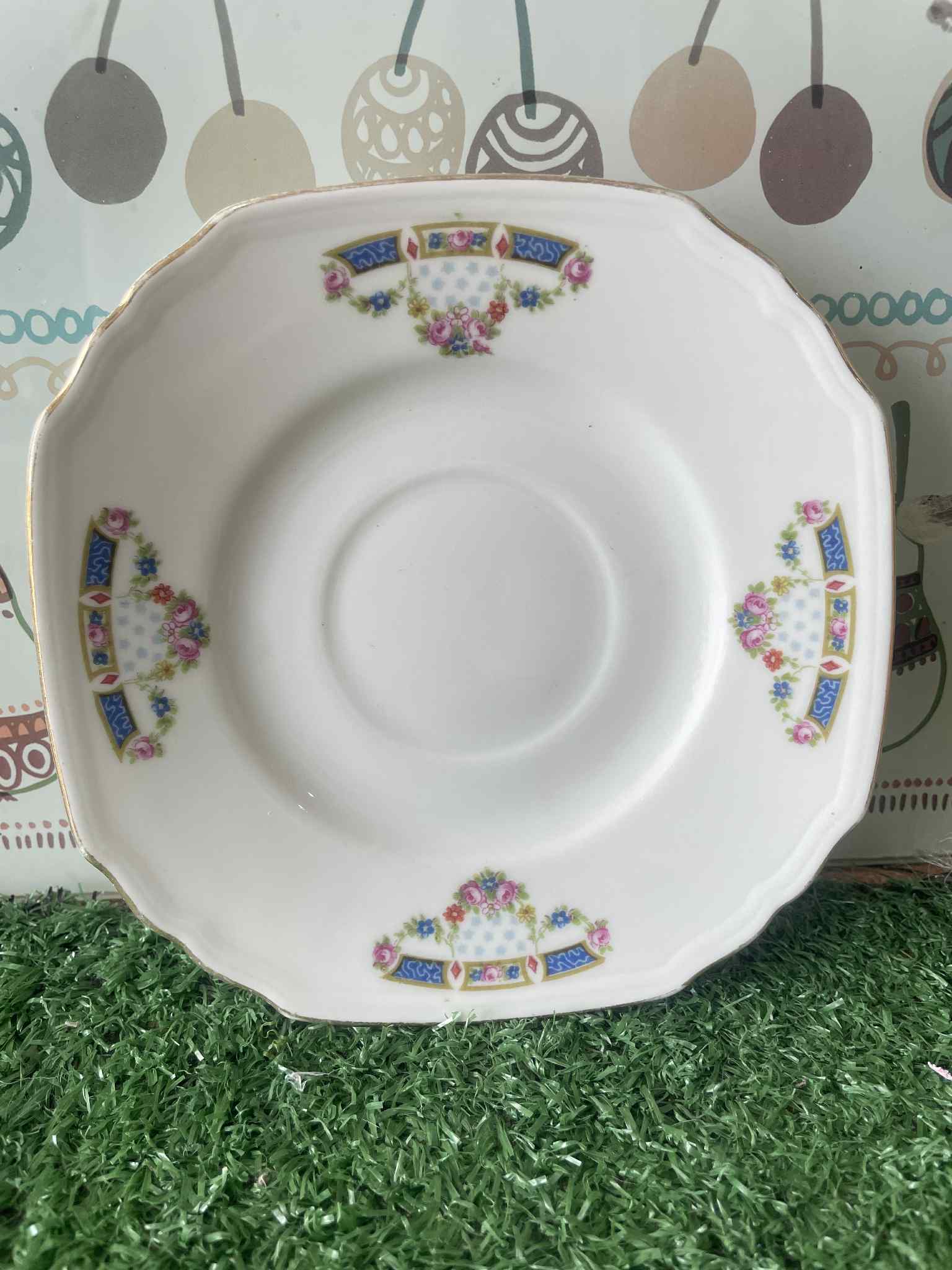 จานรองแก้วในภาพเป็นส่วนหนึ่งของชุดชา Paragon Star China ลายดอกไม้สีน้ำเงินสไตล์ Art Deco