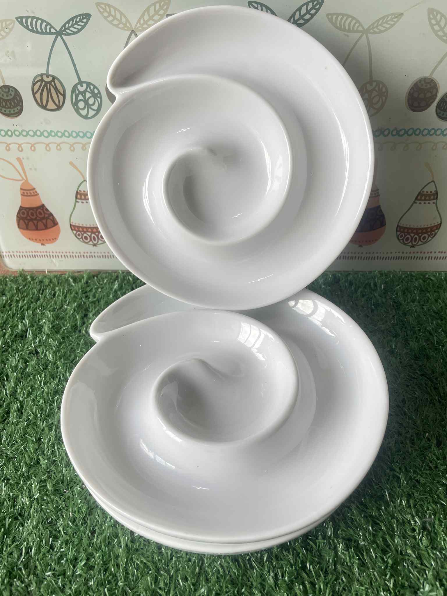 - เป็นชุดจานกระเบื้องพอร์ซเลนสีขาวที่มีดีไซน์ลายวน