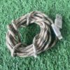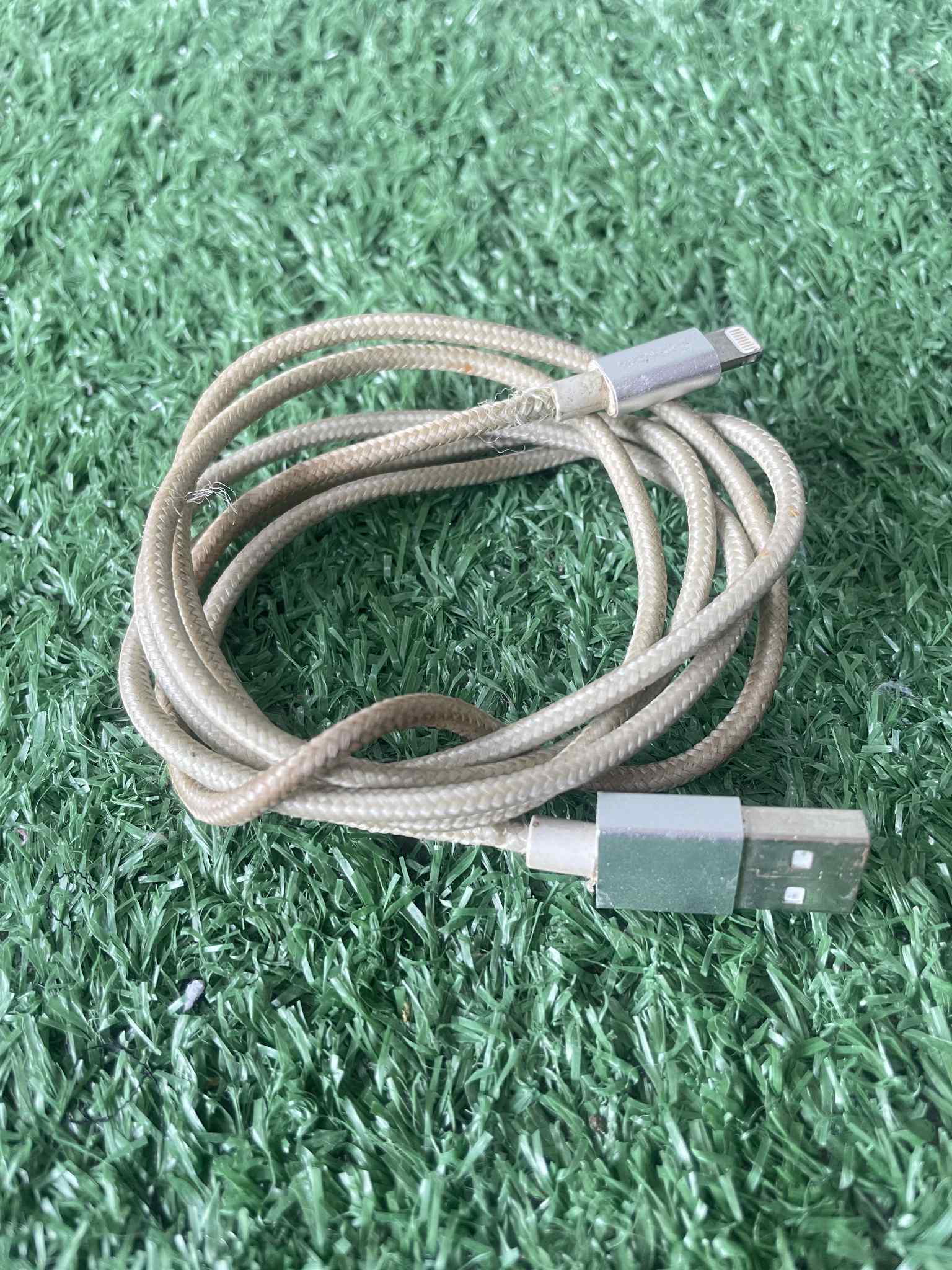 สายชาร์จเป็นสายถักสีเบจสลับดำพร้อมหัวต่อ USB-A และ Lightning